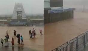 The Japali Anjaney Swami Temple at Tirumala was seen submerged due to torrential rains. The road is flooded on Char Mada Road adjacent to the main temple on Tirumala Hill. Meanwhile, two roads in the Ghats leading to Tirumala Hills have been closed for traffic due to floods and landslides.